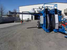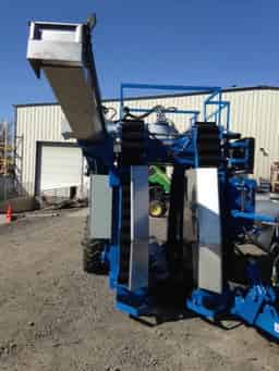 Blueline COL-GH pull type grape harvester. 540 RPM PTO pump drive with independent hydraulic system, Bow style picking head, three fan cleaning system and cane extraction system, Stainless steel slide, extra long collection system, Electric controls, wheel drive, speed control, low horse power requirement Pressure and flow compensating hydraulic system, lighting for night use.